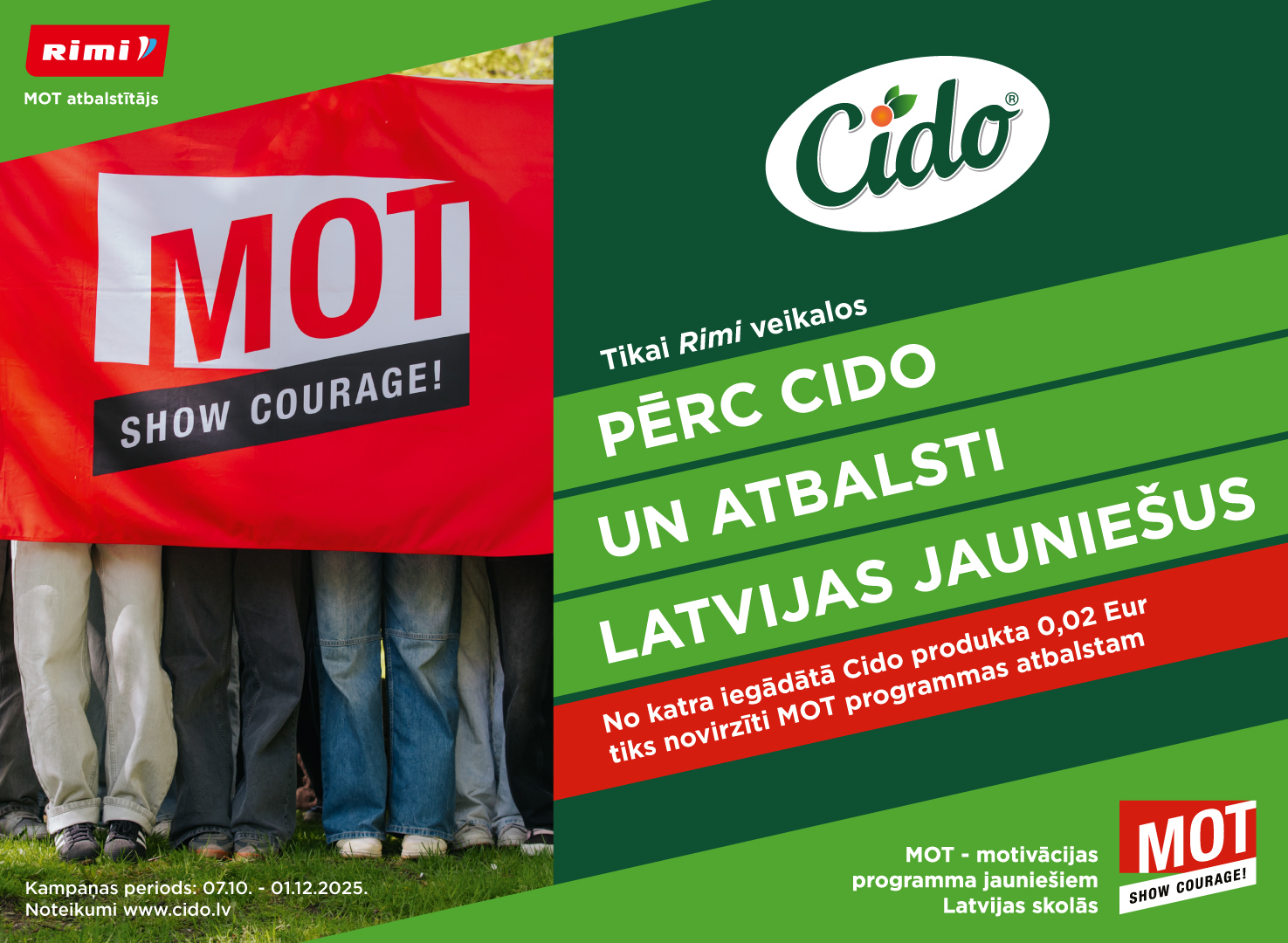 CIDO sadarbībā ar mazumtirgotāju Rimi uzsāk kampaņu atbalstam Latvijas jauniešiem. No 07.10. līdz 01.12.2024. no katra iegādātā Cido 1L produkta 0,02 Eur tiks novirzīti MOT – motivācijas programmai jauniešiem Latvijas skolās.